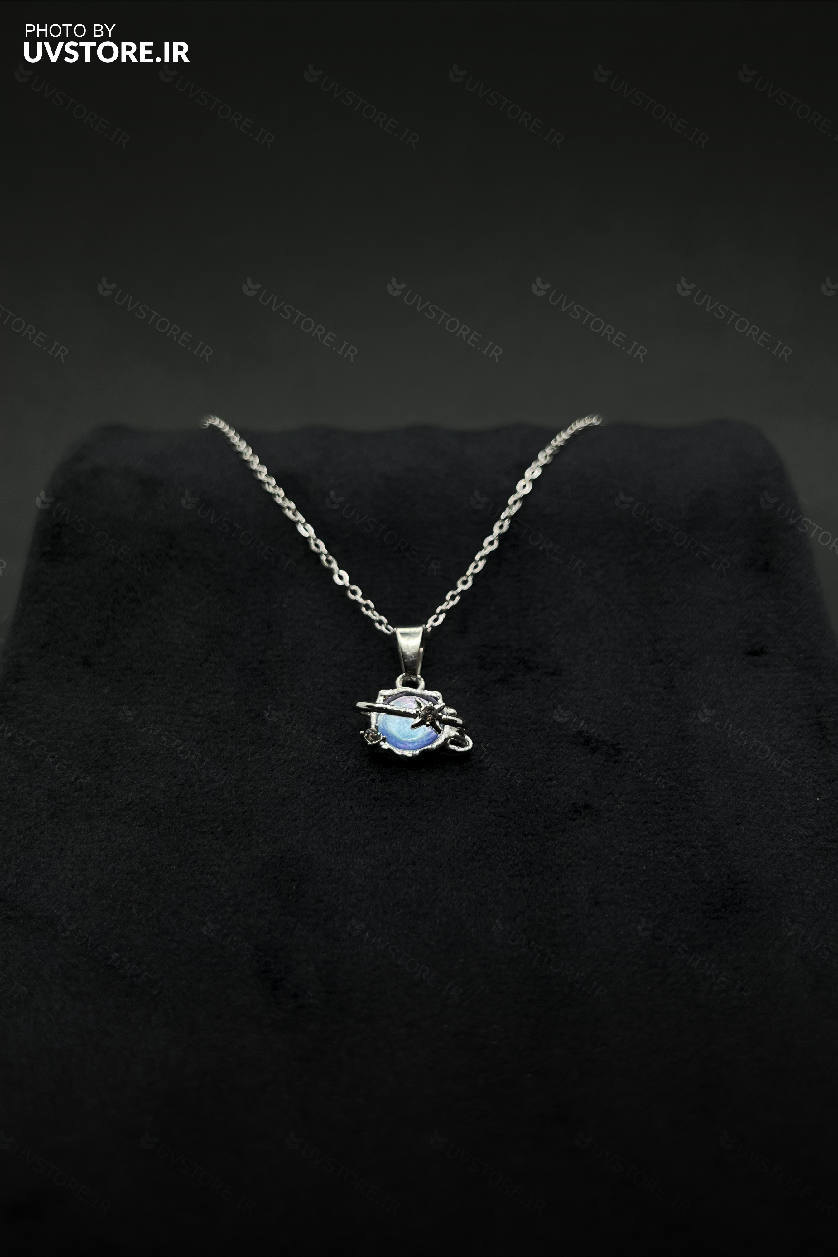 رنگ آبی و نقرهای گردنبند با تکنولوژی آبکاری و نگینکاری باکیفیت تثبیت شده و در برابر رطوبت و گذر زمان مقاوم است؛ بدون تغییر رنگ یا کدر شدن.